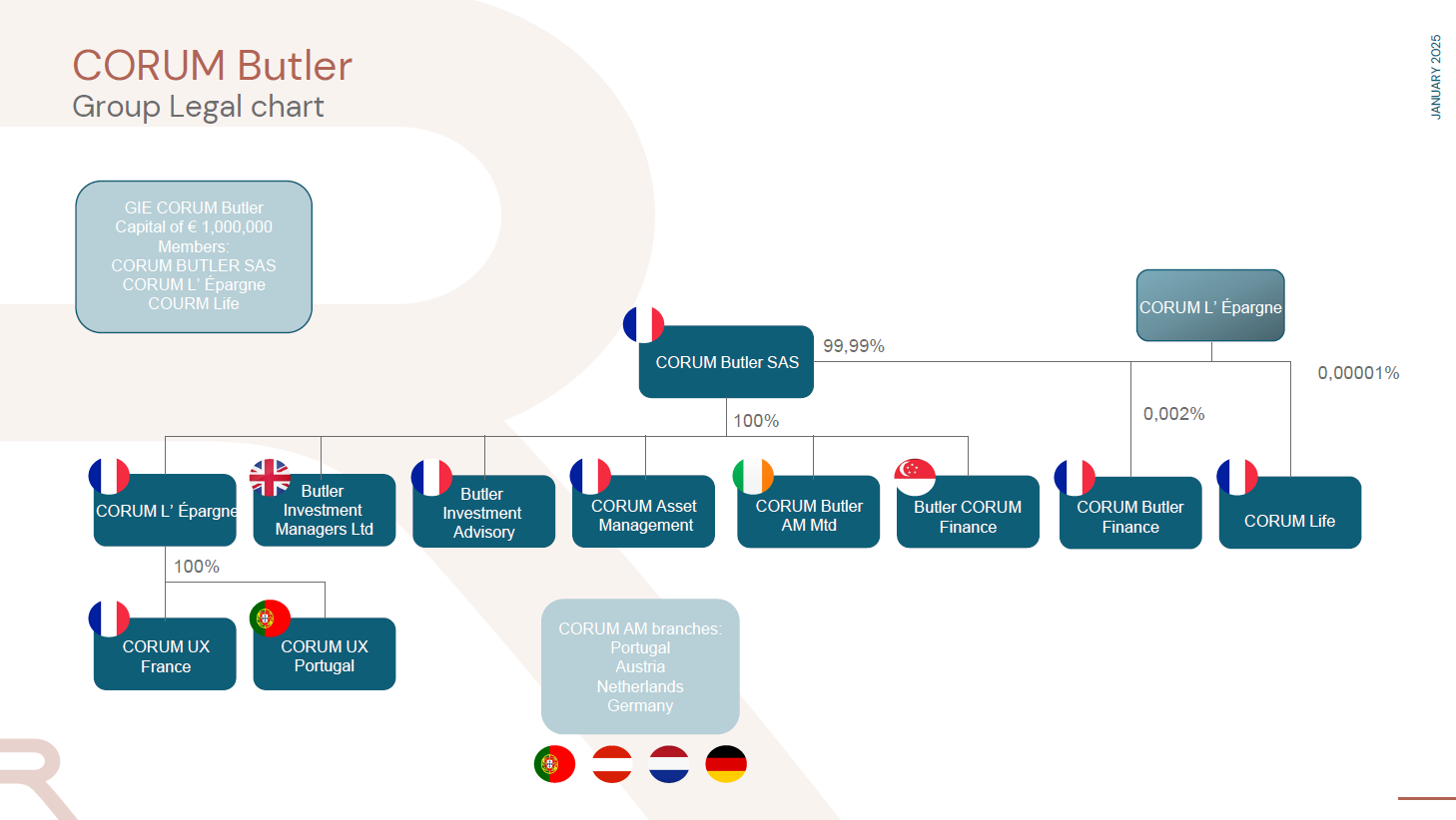 Le groupe CORUM Butler est né du rapprochement entre deux sociétés  CORUM Asset Management, créée en 2011 par Frédéric Puzin, et Butler Investments Managers, créée en 2008 par Walter Butler.